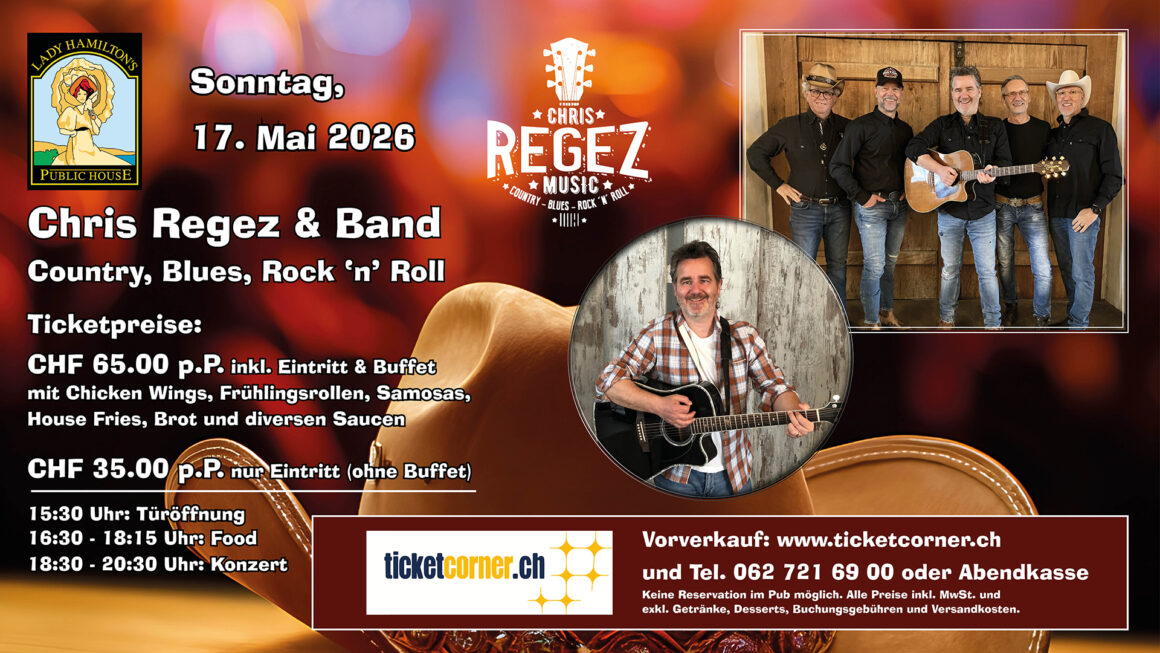 Experience Chris Regez & Band live at Lady Hamilton’s Pub in Zurich. The venue is a modern take on British pub culture, offering 30 types of beer, a fine selection of whiskies, and a relaxed rooftop terrace. Before the concert, you can enjoy delicious food from the buffet, including popular pub classics like chicken wings and more.